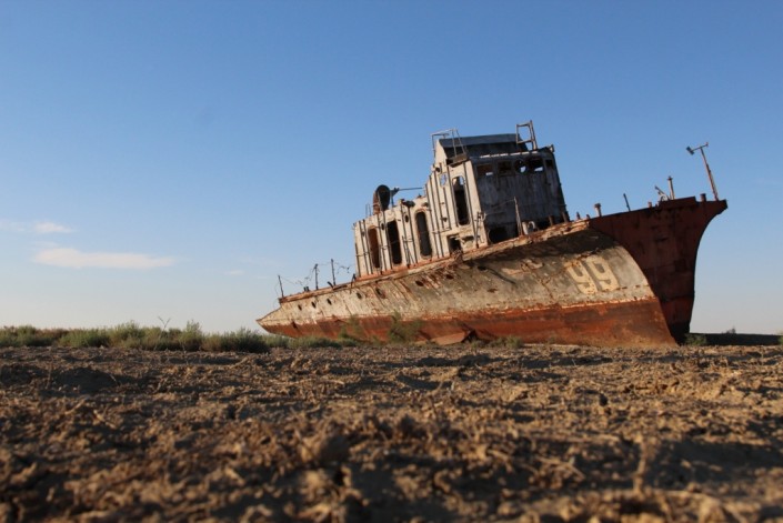 Сотни километров бездорожья и самый разнообразный пейзаж степи за окном, и вот караван экспедиции прибыл к берегу бывшего залива Аральского моря - Тущебас. Сейчас это отдельное небольшое озеро. Вблизи него в солончаках одиноко лежат, наклонившись набок, несколько ржавых кораблей.