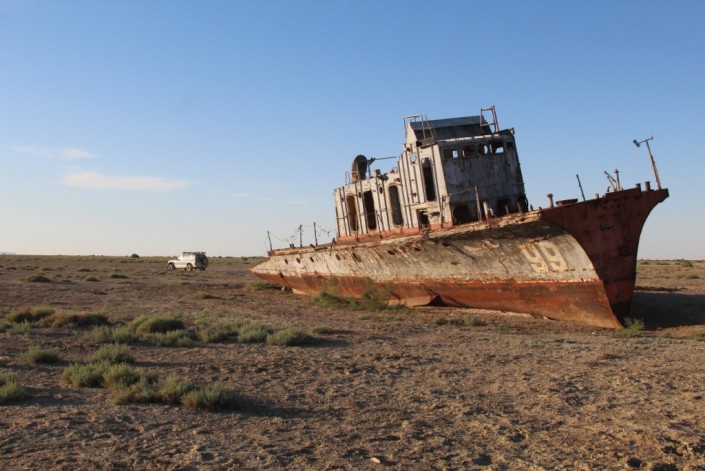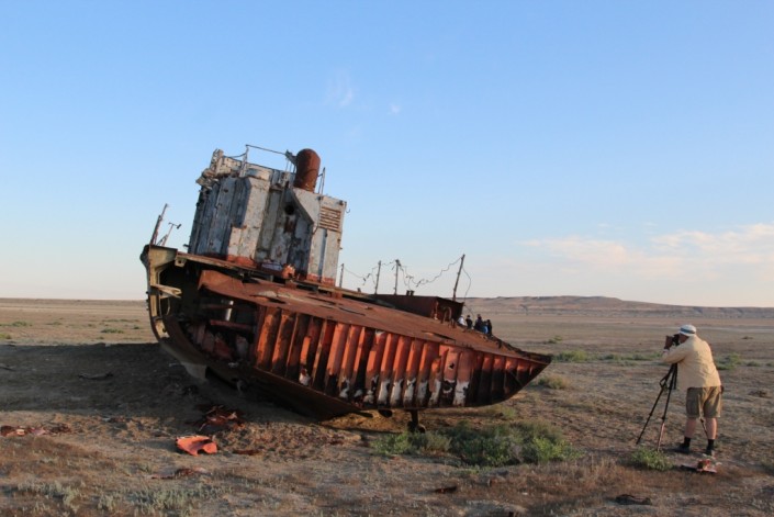 Сотни километров бездорожья и самый разнообразный пейзаж степи за окном, и вот караван экспедиции прибыл к берегу бывшего залива Аральского моря - Тущебас. Сейчас это отдельное небольшое озеро. Вблизи него в солончаках одиноко лежат, наклонившись набок, несколько ржавых кораблей.