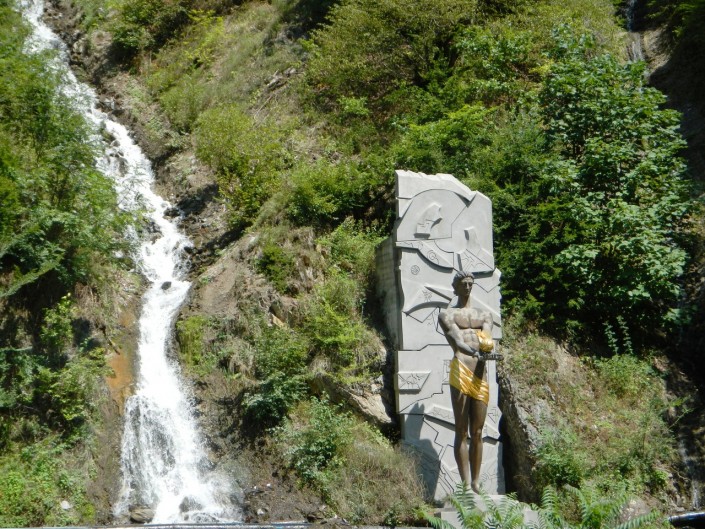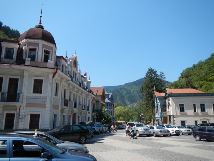 Побывали мы и в знаменитом, благодаря своей минеральной воде, городе Боржоми. Правда, основной источник, вода которого идет на розлив продукта, посмотреть не удалось. Зато мы хорошо прогулялись по парку Боржоми. Здесь нас ждало открытие - перед парком тянется улица со старинными домами с балконами и красивой резьбой на фасадах, а среди них - гостиница "Алма-Ата". Сама же парковая зона начинается с аллей, ведущих к двум источникам: с холодной газированной минералкой (то, что и разливается на заводе) и природной - теплой и приторной. Дальше следует парк развлечений с детскими аттракционами, оканчивающийся водопадом со статуей Прометея. Здесь же асфальт заканчивается, и по грунтовой тенистой дороге, отшагав примерно полтора километра, можно добраться до поляны с двумя бассейнами, наполненными минеральной водой.