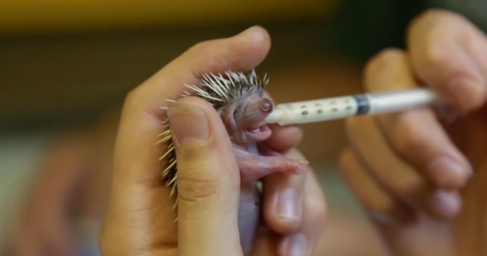 Маленького ежа выкармливают из шприца