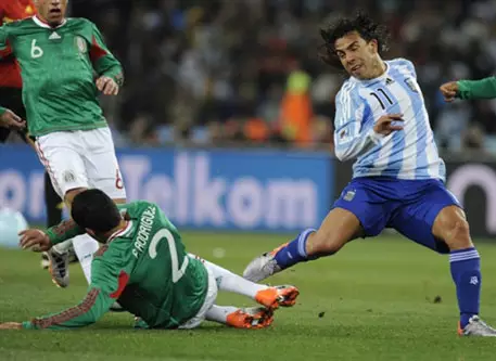 Сборная Аргентины обыграла команду из Мексики в первом раунде плей-офф чемпионата мира по футболу, который проходит в ЮАР, сообщается на официальном сайте ФИФА. Матч завершился со счетом 3:1 в пользу бело-голубых. Здесь можно увидеть онлайн-трансляцию этой встречи. У аргентинцев дважды отличился нападающий Карлос Тевес. На 26-й минуте после пасса Месси он открыл счет в игре. Этот гол вызвал протест со стороны "ацтеков", доказывавших офсайд у игрока "Манчестер Сити". Однако главный арбитр матча Роберто Розетти после консультации с боковым судьей засчитал очко. Вторым успехом форварда стало взятие ворот соперника на 52-й минуте ударом с дальней дистанции. Окончательную точку в игре поставил английский форвард Гонсало Игуаин, отличившийся на 33-й минуте. Автором единственного гола в ворота "альбиселесты" на 71-й минуте стал мексиканский нападающий Хавьер Эрнандес. В следующем матче подопечным Диего Марадоны предстоит встретиться со сборной Германии, которая ранее одержала победу над английской командой.