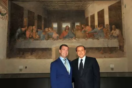 Премьер-министра Италии Сильвио Берлускони осудили за то, что он снялся на память с российским президентом Дмитрием Медведевым на фоне фрески Леонардо да Винчи "Тайная вечеря", пишет The Daily Mail. Фотоснимок был сделан 23 июля 2010 года во время визита Медведева в Милан. Итальянский премьер-министр показывал гостю монастырь Санта-Мария делле Грацие, где и находится знаменитое произведение художника. Смотритель художественных ценностей Милана Альберто Артиоли (Alberto Artioli) рассказал, что позволил сделать трем фотографам снимки, так как не видел в этом ничего особенного. По его словам, было сделано всего три снимка. Кроме того, фотографам запретили брать крупный план и отвели на расстояние. Искусствоведы убеждены, что фотовспышка может нанести ущерб художественному произведению. Известно, что обычным посетителям запрещено фотографировать в залах монастыря, также как курить, пользоваться мобильными телефонами и проносить мокрые зонты, еду и напитки. "Конечно, несколько фотографий, возможно, и не повредили "Тайной вечере", но дело в принципе - остальным запрещено фотографироваться, а им (Берлускони и Медведеву) можно", - заключил итальянский депутат Давиде Корриторе (Davide Corritore). Фреска "Тайная вечеря" была написана Леонардо да Винчи в 1495 - 1498 годы. Краски произведения оказались очень неустойчивыми, так как художник писал темперой не по мокрой штукатурке, а по сухой стене.