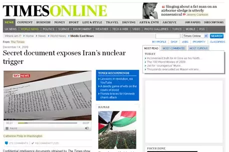 The Times опубликовала статью Secret document exposes Iran’s nuclear trigger со ссылкой на некие секретные документы 14 декабря 2009 года. В редакцию газеты попала техническая документация Ирана от 2007 года, описывающая процесс создания бомбы, рассчитанный на четыре года. Представитель британского министерства иностранных дел и по делам содружества заявил, что "этот документ, если он подлинный, поднимает серьезные вопросы относительно намерений Ирана". Свое беспокойство по поводу обнаруженных данных также выразил Израиль.