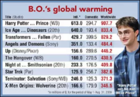 Больше всего этим летом собрал релиз долгожданной картины "Гарри Поттер и Принц-полукровка". Шестая часть поттерианы принесла в мировом прокате 907,7 миллиона долларов. На втором месте - мультфильм "Ледниковый период 3: эра динозавров", собравший 833,4 миллиона долларов. За ним с небольшим отрывом следуют "Трансформеры 2: Месть падших" (829,2 миллиона долларов). На пятом месте фигурирует мультфильм "Вверх!" с выручкой в 446 миллионов долларов.