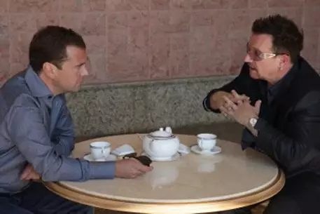 Российский президент также подчеркнул способность Боно одновременно достигать успехов и в музыке, и в благотворительности. "Когда люди начинают слишком активно заниматься общественной деятельностью, музыка заканчивается, а с вами этого не случилось", - сказал глава РФ. Отметим, что лидер U2 прибыл в Россию в рамках мирового турне в поддержку своего нового альбома. Первое выступление в РФ в истории коллектива состоится 25 августа в Лужниках.