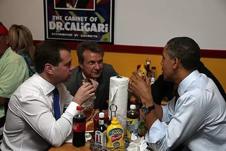 Стало известно и о неофициальной программе встречи Медведева с Обамой. "Сегодня мне удалось пообедать с Президентом Бараком Обамой в весьма интересном местечке. Оно было типично американское. Может быть, это не очень полезно для здоровья, зато очень вкусно и, самое главное, чувствуешь дух Америки", - заявил Медведев. Выяснилось, что после встречи в Овальном кабинете президенты позавтракали гамбургерами и картофелем фри в арлингтонском кафе Ray's Hell Burger ("Адский гамбургер Рэя"). При этом Медведев, по совету своего американского коллеги, попробовал бургер с перцем халапеньо. Последний знаменит усиливающейся в процессе еды остротой. По сообщениям местных СМИ, в такие вашингтонские кафе с фаст-фудом часто заходят представители американских властей и зарубежные государственные деятели. В мае прошлого года Обама уже водил в Ray's Hell Burger своего заместителя Джо Байдена. Тогда вице-президент США также ел бургер с халапеньо. Тот завтрак стал настоящей сенсацией в американских СМИ и был признан событием, выходящим из ряда вон. Однако нашлись журналисты, которые отметили, что Обама просто любит публично угощать людей. При этом они напомнили о случае, произошедшем во время его избирательной компании на верховный государственный пост. Тогда будущий президент США купил всем присутствующим на его выступлении журналистам мороженое. Особенно ехидные представители прессы отметили, что после такого завтрака Обама и Байден "восстали из ада", намекая на название кафе. К слову, когда Обама был в Москве в июле прошлого года, российский премьер Владимир Путин также угощал гостя "национальной кухней". Это была первая встреча Обамы и Путина и окончательное решение об ее формате было принято перед самым ее началом. Тогда гротеск зашкаливал, компенсируя обыденность места его проведения и присутствие других официальных лиц. Завтрак состоялся в подмосковной резиденции премьера в Ново-Огарево. Президент США позавтракал оладьями, пельменями и икрой и запил чаем из самовара, который был разогрет при помощи сапога. Американского гостя развлекал "неожиданно" прибывший на завтрак оркестр русских народных инструментов.