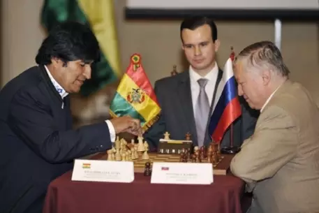 Президент Боливии Эво Моралес сыграл вничью с 12-м чемпионом мира по шахматам Анатолием Карповым, сообщает РИА Новости. Политик и шахматист провели поединок в среду, 23 июня, в Президентском дворце в столице Боливии Ла-Пасе. Он транслировался в прямом эфире государственного телевидения.