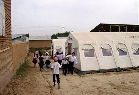 "В школе имени Толстого учились 685 ребят, сейчас они все посещают палаточную школу, занятия проходят в две смены, – рассказывает завуч Алтынай Бадалова. – Здесь работают те же 45 учителей, что работали и прежде. Никто не пропускает уроков. Некоторые младшеклассники проводят здесь почти целый день. А ученики постарше после уроков помогают своим родителям и соседям на стройке. Единственное, чего нам не хватает, – учебников, мы обеспечены ими процентов на 47".