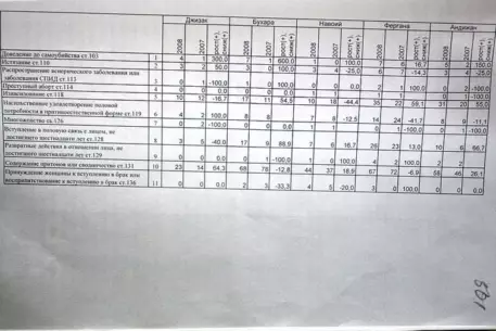 Документ, датированный 20 октября 2009 года, показывает количество и динамику некоторых видов преступлений, совершенных женщинами и в отношении женщин в период с 2007 по 2008 годы. В указанное время были зарегистрированы следующие категории преступлений: "Доведение до самоубийства" - 2007 год - 41 случай, 2008-й - 63 случая. "Истязание" - соответственно 86 и 90 случаев. "Распространение венерического заболевания или заболевания СПИД" - 14 и 12 случаев. "Преступный аборт" - шесть и пять случаев. "Изнасилование" - 321 и 365 случаев. "Насильственное удовлетворение половой потребности в противоестественной форме" - 154 и 123 случая. "Многоженство" - 23 и 13 случаев. "Вступление в половую связь с лицом, не достигшим 16 лет" - 197 и 214 преступлений. "Содержание притонов или сводничество" - 1202 и 1316 случаев. "Принуждение женщины к вступлению в брак или воспрепятствование к вступлению в брак" - 37 и 41 случай.