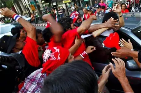 Столкновение между правительственными войсками и мятежниками продолжается на улице имени короля Рамы Четвертого, полностью очищенной от автомобильного движения. "Краснорубашечники" в трех местах зажгли политые горючей смесью автомобильные покрышки, чтобы препятствовать движению отрядов солдат. Военные вооружены помповыми ружьями с резиновыми пулями. Боевое оружие пока не применяется.