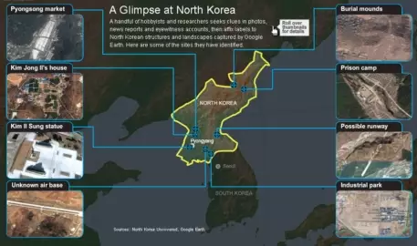 Кандидат наук Кертис Мелвин (Curtis Melvin) из Университета Джорджа Мейсона (George Mason University) добавил в онлайн-карту спутниковые снимки ракетных пусковых площадок, тюремные здания и элитные дворцы лидера Северной Кореи Ким Чен Ира (Kim Jong-Il), пишет The Wall Street Journal. Группа энтузиастов во главе с Мелвином на протяжении последних двух лет заполняют пробелы на карте одной из самых закрытых стран мира - Северной Кореи. На этот сайт более 35 тысяч людей прислали файлы со снимками, новостями и записями. Люди комментируют снимки, сделанные с Google Earth. Например, комментируют фотографии предполагаемых реакторов, хранилищ ракет. Собирая данные о Северной Корее Мелвин обнаружил места массовых захоронений. В результате голода в 1995-1998 годах по всей стране погибли более двух миллионов человек. На других снимках отчетливо видны роскошные дома, бассейны и водные горки в имениях лидеров страны. Этот проект также привлек выходца из России Андрея Ланькова, который изучает историю Северной Кореи в Сеуле. Прошлым летом Ланьков прислал Мелвину расположения нескольких рынков. Один из них самый крупный в Северной Корее называется Пьонсонг (Pyongsong). Gulags, Nukes and a Water Slide: Citizen Spies Lift North Korea's Veil - The Wall Street Journal, 22.05.2009 North Korean economy watch