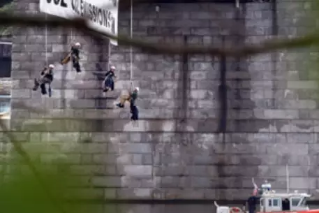 Девять членов международной организации были задержаны за размещение на мосту West End баннера, предупреждающего об опасных последствиях изменения климата. Плакат провисел около двух часов. Пять активистов Greenpeace были взяты под стражу на другом мосту за аналогичное деяние. Всем 14 арестованным грозят обвинения в незаконном проникновении и тайном сговоре.