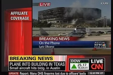 В здание расположенной в административном центре штата Техас городе Остин (Austin) налоговой службы врезался легкомоторный самолет, сообщает телеканал CNN. По данным РИА Новости, неподалеку от места катастрофы расположено здание отделения ФБР по Техасу. Легкомоторный самолет врезался во второй этаж семиэтажного здания. Прибывшие на место инцидента сотрудники спасательных служб обнаружили масштабные разрушения. По предварительным данным, в результате катастрофы пострадали два человека. Они госпитализированы с ожогами. О состоянии здоровья пострадавших пока не сообщается. Еще один человек числится пропавшим без вести. Очевидцы утверждают, что самолет летел прямо в здание, а не рухнул на него с высоты. По данным телеканала, управлявший воздушным судном человек угнал его. Он вылетел из города Джорджтаун. Перед этим пилот поджег собственный дом. О мотивах управлявшего воздушным судном пока ничего не известно. Ранее представители и министерства внутренней безопасности США утверждали, что произошедший инцидент не является терактом.