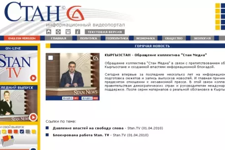 В Киргизии закрыли интернет-портал Stan.TV, сообщает "Интерфакс-Казахстан". В настоящее время работа портала в Киргизии приостановлена, сотрудники не имеют доступа к оборудованию. При проверке деятельности информационного портала финансовая полиция обнаружила факт ввоза из Казахстана 200 тысяч долларов, которые не были задекларированы. В финполиции также сообщили, что у компании отсутствуют документы о происхождении оборудования, а на компьютерах установлено нелицензионное программное обеспечение. На сайте Stan.TV размещено обращение сотрудников бишкекского офиса компании. "В результате действий сотрудников финансовой полиции работа бишкекского офиса "Стан Медиа" полностью парализована. Опечатаны кабинеты сотрудников, компьютеры для монтажа видеоматериалов изъяты, наложен арест на оргтехнику", - говорится в обращении. "Столь жесткие действия фискальных органов, по нашему мнению, вряд ли могли быть предприняты без согласования с высшими органами государственной власти", - отметили журналисты, назвав происходящее "фактом прямого давления на свободу слова". По мнению оппозиции, случившееся является "противозаконным актом, связанным с ограничением доступа граждан к информации". Приостановление работы портала назвали политически мотивированным, так как "независимая компания в своих материалах открыто поднимает острые социальные и политические проблемы в республике". 1 апреля также была приостановлена деятельность оппозиционной киргизскоязычной газеты "Форум". Информационный видеопортал "Stan.TV" начал работу 1 марта 2007 года. Ресурс освещает события в государствах Центральной Азии - Кыргызстане, Казахстане, Туркменистане, Узбекистане и Таджикистане. На сайте также транслируются онлайн-выпуски "Stan TV: on-line".