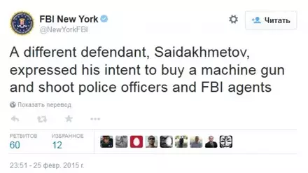 Казахстанец Ахрор Сайдахметов был задержан в Нью-Йорке, также были арестованы его сообщники - граждане Узбекистана 24-летний Абдурасул Джурабоев и 30-летний Аброр Хабибов. Джурабоев попал в поле зрения правоохранительных органов в августе 2014 года после публикации поста на узбекском языке в поддержку ИГ. Следователи выяснили, что Джурабоев и Сайдахметов планировали через Турцию попасть в Сирию, чтобы присоединиться к ИГ. Казахстанец Сайдахметов был задержан рано утром 25 февраля в аэропорту имени Джона Кеннеди при попытке сесть на рейс в Стамбул. Джурабоев купил билеты до Турции на март. Хабибов финансово помогал Сайдахметову добраться до Сирии.