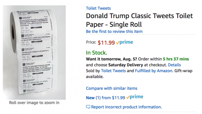 Amazon selling toilet paper printed with Trump tweets https://t.co/UfVWhCsqws pic.twitter.com/GvPzR83fQU