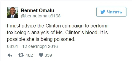 Известный американский судмедэксперт Беннет Омалу предположил, что причиной недавнего обморока Хиллари Клинтон, возможно, стало отравление. На своей странице в Twitter патологоанатом порекомендовал избирательному штабу демократов "сделать токсикологический анализ крови госпожи Клинтон".
