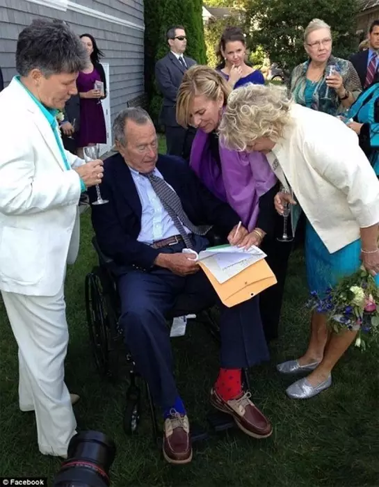 Экс-президент США принял участие в церемонии бракосочетания двух жительниц штата Мэн - Бонни Клемент и Хелен Торгальсен. На церемонии, помимо Буша-старшего, присутствовала его супруга Барбара Буш. Позднее Торгальсен выложила в Facebook фото, на котором бывший президент подписывает документы в качестве свидетеля на бракосочетании.
