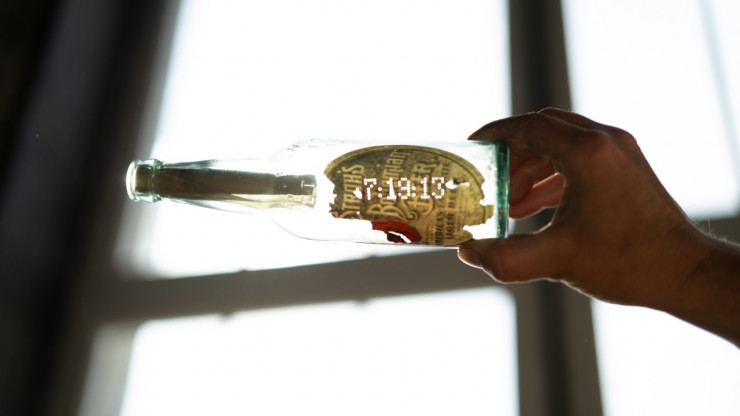 Старая пивная бутылка с посланием была спрятана за карнизом на стене. На бутылке выбита дата "7.19.13", что совпадает с первоначальной постройкой здания, которое было заброшено в 1988 году.
