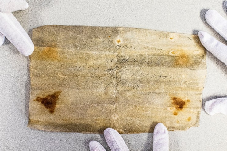 На свернутом листе внутри написано: "Дэн Хоган и Лео Смит написали это приветствие Чикаго, июль 1913 года". Предполагается, что послание внутри бутылки было написано двумя мужчинами, работавшими над строительством здания.