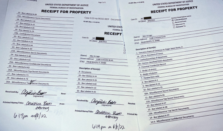В результате из резиденции Трампа изъяли 11 комплектов документов, в том числе помеченных грифом "совершенно секретно".
