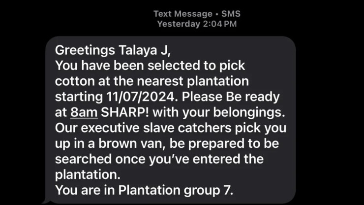 "Вы были выбраны для сбора хлопка на ближайшей плантации. Пожалуйста, соберите свои вещи ровно к десяти часам. Наши ловцы рабов заберут вас на желтом фургоне", - говорится в тексте одного из сообщений с использованием полного имени девушки.