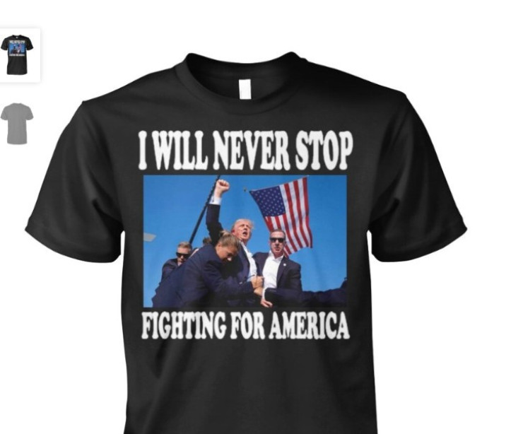 Другие продавцы за 19,99 долларов предлагают футболки с фото раненого Трампа с подписью: "Я никогда не остановлюсь".