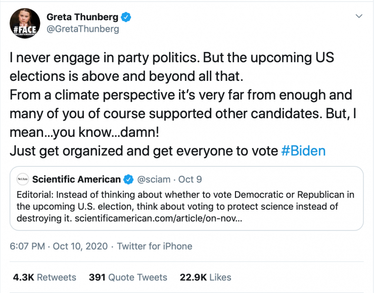 Тунберг написала, что никогда не занималась партийной политикой, но, по ее убеждению, нынешние выборы президента США выходят за эти рамки.