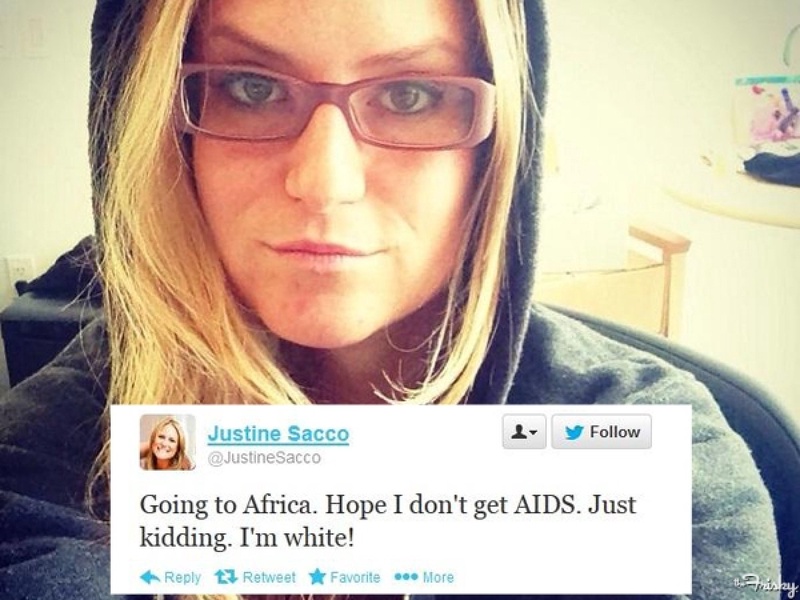 PR-менеджер крупной медиа-компании InterActiveCorp (IAC) Джастин Сакко (Justine Sacco) направлялась в командировку в Африку. "Еду в Африку. Надеюсь, не подхвачу СПИД. Шучу. Я - белая", - написала она своем аккаунте в Twitter.