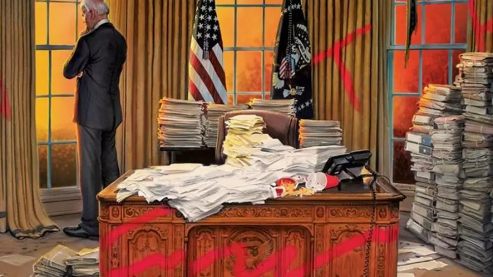 Изображенный на передовице Овальный кабинет завален документами. На шторе баллончиком нарисована буква Т, а на полу лежит знаменитая красная бейсболка Трампа с надписью Make America great again.