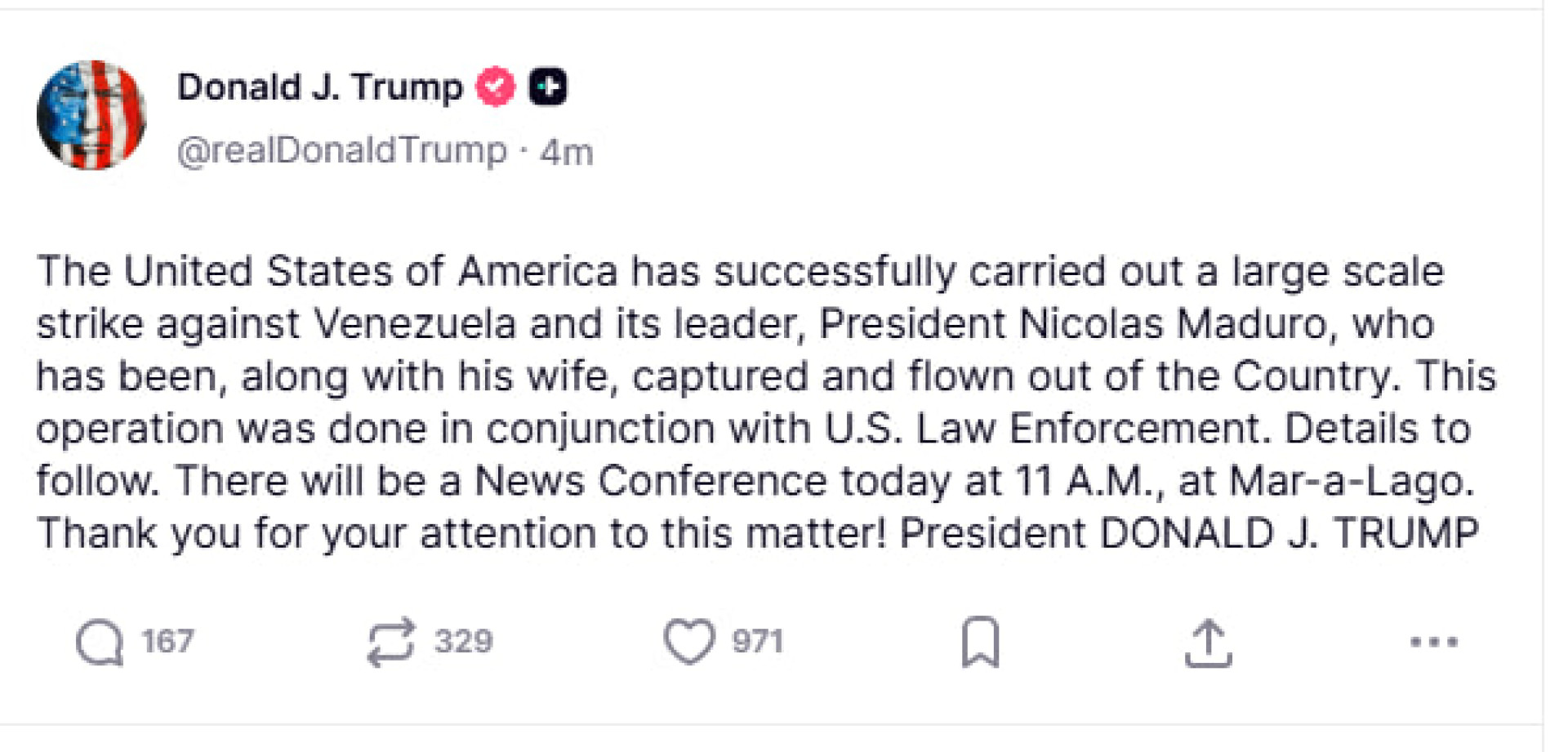 "Соединённые Штаты Америки успешно провели крупномасштабный удар против Венесуэлы и её лидера — президента Николаса Мадуро, который вместе со своей супругой был захвачен и вывезен из страны. Операция была проведена совместно с правоохранительными органами США", — написал он в соцсети Truth Social.