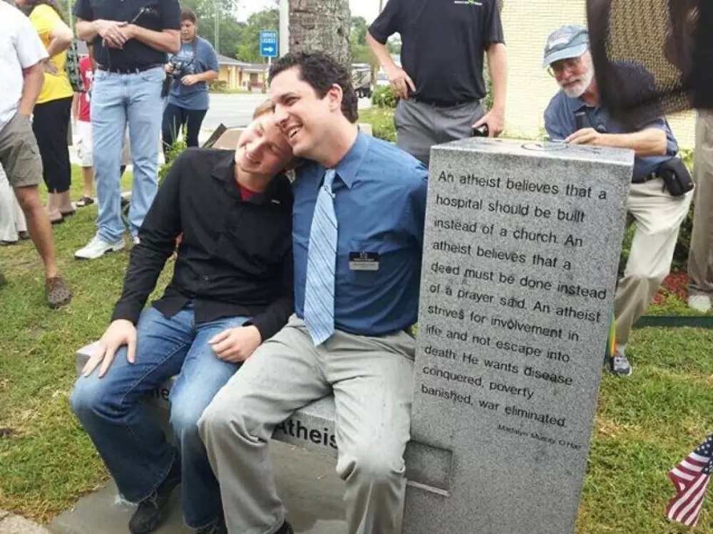 На памятнике в виде скамейки выгравированы цитаты отцов-основателей США, известных атеистов и список наказаний за нарушение десяти Библейских заповедей. Члены организации "Атеисты Америки", по чьей инициативе был установлен памятник, заявили, что вскоре подобные монументы появятся в каждом из 50 штатов. Президент организации Дэвид Сильверман (David Silverman) заявил: "Атеисты Америки" приложат свои усилия для того, чтобы правду поместили рядом с ложью, а цивилизацию - с варварством".