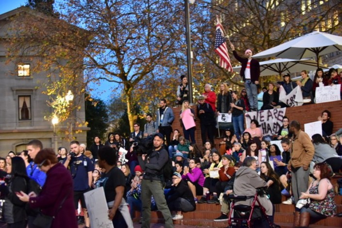 Протесты против избрания Трампа президентом США переросли в беспорядки в Портленде, сообщает корреспондент Tengrinews.kz со ссылкой на Oregon Live.