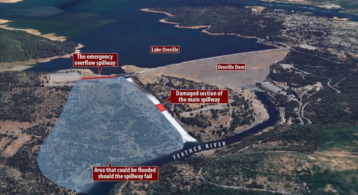 В субботу из-за сильных дождей началась эрозия сначала основного, а затем и вспомогательного водосбросов дамбы. По словам шерифа округа Батте, это может привести к "неконтролируемому сбросу воды из озера Оровилл" и затоплению ближайших населенных пунктов - Оровилл, Гридли, Биггс, Юба-Сити, Лома Рика, Лайв Ок, Мэрисвилл, Уитленд и других.