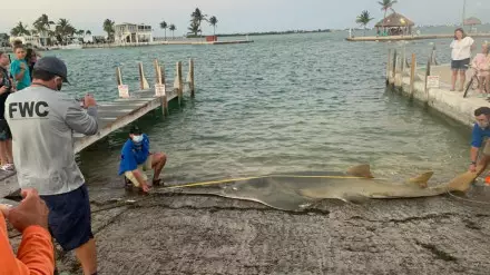 Огромную тушу рыбы-пилы (пилорылый скат) выбросило на берег у острова Марвин-Ки во Флориде. Сообщается, что длина найденной рыбы 4,9 метра, это на 20 сантиметров больше самого крупного пилорылого ската, когда-либо попадавшего в руки исследователей.