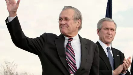 Дональд Рамсфелд родился в Чикаго в 1932 году. За время своей карьеры он возглавлял Пентагон дважды – с 1975 по 1977 год в администрации Джеральда Форда и затем с 2001 по 2006 год при Джордже Буше. Рамсфелд, начавший карьеру на флоте, затем ушел в политику и работал в Конгрессе. Завершение его карьеры на посту министра обороны прошло на фоне скандала вокруг пыток заключенных в американских тюрьмах по всему миру.