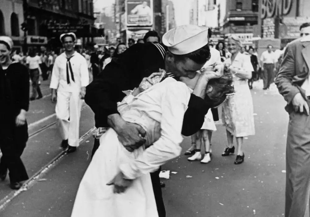 Снимок "Поцелуй на Таймс-сквер" также известен как "День Победы над Японией на Таймс-сквер" (VJ-Day in Times Square) или "Матрос целует медсестру". Он был сделан фотографом Альфредом Эйзенштадтом 14 августа 1945 года в Нью-Йорке и стал образом праздника победы по всей стране. На фотографии запечатлен моряк Джордж Мендоса, целующий некую Грету Фридман, одетую в белое платье.