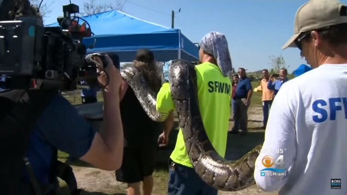 В национальном парке Эверглейдс (штат Флорида, США) охотник "голыми руками" поймал пятиметрового питона, сообщает WFOR.