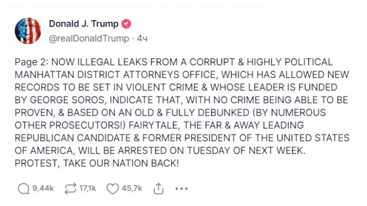 "Ведущий кандидат от Республиканской партии и бывший президент Соединенных Штатов Америки будет задержан во вторник на следующей неделе. Выходите на протесты, верните нашу страну!" - написал Трамп в своей соцсети Truth Social.