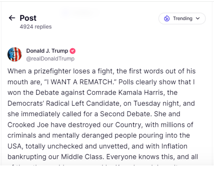 "Когда боксер проигрывает бой, первые слова из его уст: "Я хочу повторного поединка". Опросы ясно показывают, что во вторник вечером я выиграл дебаты у товарища Камалы Харрис, леворадикального кандидата от демократов, и она немедленно потребовала проведения вторых дебатов. (...) Она не явилась на дебаты на Fox и отказалась выступать на NBC и CBS. Камала должна сосредоточиться на том, что ей следовало делать в течение последнего почти четырехлетнего периода. Третьих дебатов не будет", - заявил Трамп.