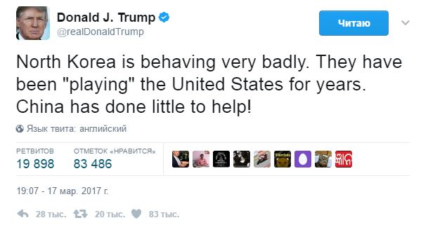 О "плохом поведении Северной Кореи" Трамп заявлял и ранее. Так, 17 марта в своем Twitter американский президент обвинил КНДР в том, что представители Корейской Народно-Демократической республики "играют" с США годами.