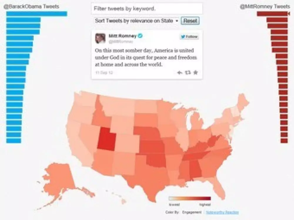 Согласно подсчетам Twitter, наиболее популярным твитом кандидата от демократов Барака Обамы стал следующий: "Ни одна семья не должна откладывать письмо о приеме в колледж из-за того, что у них нет денег". Самым цитируемым сообщением республиканца Митта Ромни стало его высказывание об 11 сентября.