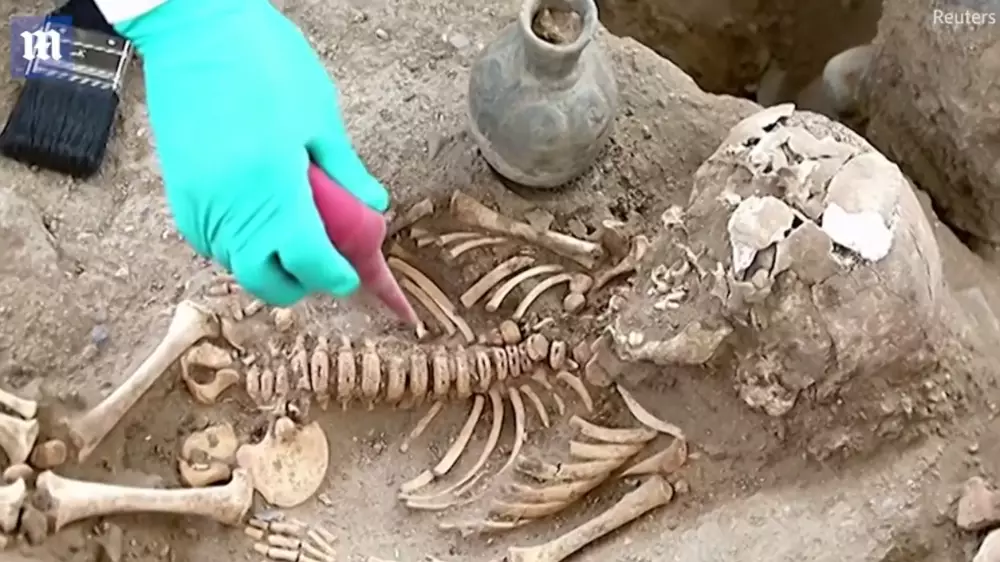 Тела были в сидячем положении и завернуты в несколько слоев ткани, первый из которых был из хлопка, а второй - из растительного материала. Вместе с ними в могиле обнаружили 50 керамических изделий.