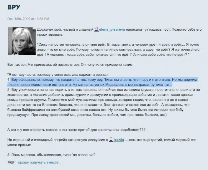 В октябре 2009 года Любимова написала пост о "вранье": "Я вот вру часто, поэтому у меня есть два варианта вранья: 1. Вру официально, потому что насрать на тех, кому вру. Типа: вы знаете, что я вру, и я это знаю. Но мы держим лицо и продолжаем нести вот все это. Ну как на встречах Медведева с министрами, ну типа так... 2. Вру упоически и начинаю верить в то, как правильно я сейчас все изложила..."