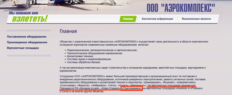 На своем сайте фирма сообщает, что ее сотрудники "имеют большой производственный и организационный опыт по поставкам и внедрению радиотехнического оборудования, источников резервного электропитания, ремонту антенных полей, поставке аэровокзального оборудования и досмотровой техники… на вертолетных площадках резиденций президента РФ "Бочаров ручей", "Ново-Огарево", "Прасковеевка".