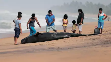 Жители деревни нарушили комендантский час в Панадуре, к югу от столицы Коломбо, и присоединились к военно-морскому флоту, чтобы перенести китов обратно в море.