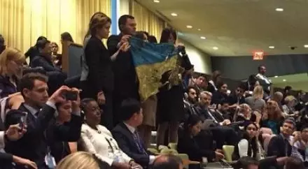 "Перед выступлением Путина делегация Украины вышла из зала Генассамблеи ООН. На балконе напротив трибуны активисты развернули флаг Украины (по словам постпреда Киева при ООН Юрия Сергеева, полотно прибыло из Иловайска. - Прим.), расстрелянный на войне в Донбассе", - сообщила Гопко.