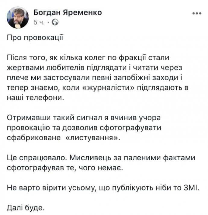 "После того как несколько коллег по фракции стали жертвами любителей подглядывать и читать через плечо, мы применили определенные меры предосторожности и теперь знаем, когда "журналисты" подсматривают в наши телефоны. Получив такой сигнал, я подстроил вчера провокацию и позволил сфотографировать сфабрикованную "переписку", - написал нардеп.