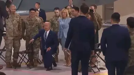 На записи видно, как 78-летний глава Белого дома в течение нескольких секунд разговаривает с солдатами, после этого разворачивается и встает на правое колено. При этом политику пришлось опираться на стоящий рядом стул. Как только фотографы сделали несколько кадров, американский лидер встал и продолжил общение в нормальной позе.