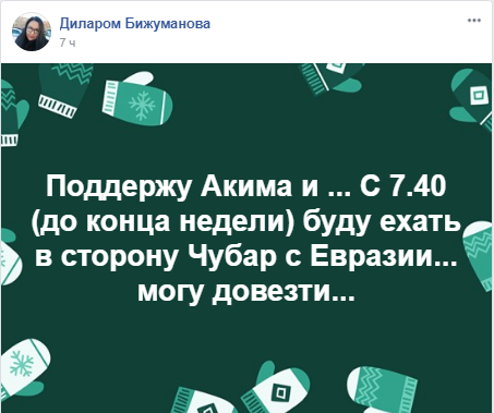 "Доброе время суток. Утром в 7.45 выезжаю с угла проспекта Богенбай батыра - Республики до НИШ за Назарбаев Университетом. Маршрут по Республике, через Самал, Чубары, Дом министерств, Мангилик ел, Арка, Экспо, НИШ. Имеется только одно свободное место. Если есть попутчик, готов забрать. Так как на остановках сегодня очень сложно было найти попутчика, все же удалось, конечно. А не попутчика бы тоже хотелось подвезти, но на работу опаздывать не можем. Обращаться по телефону +77019001739. Обратный маршрут когда как, в разное время по-разному. Можно также по телефону", - поделился аким публикацией жителя города Бейбута Амана.